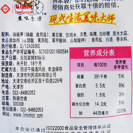 配料表:辣椒酱(辣椒、食用盐)、黄豆酱、饮用水、洋葱、白砂糖、味精、脱水大蒜、食品添加剂(冰醋酸、黄原胶、苯甲酸钠、山梨酸钾)、食用盐、白酒、香辛料