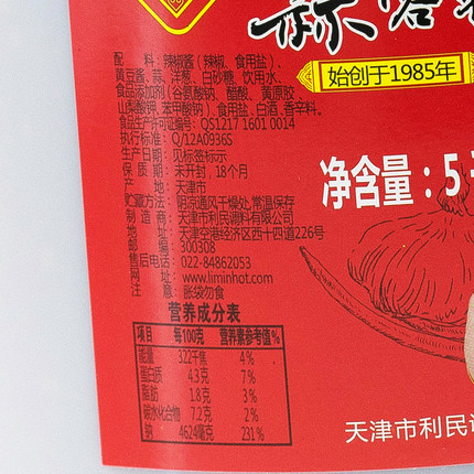 配料表:辣椒酱(辣椒、食用盐)、黄豆酱、饮用水、洋葱、白砂糖、味精、脱水大蒜、食品添加剂(冰醋酸、黄原胶、苯甲酸钠、山梨酸钾)、食用盐、白酒、香辛料