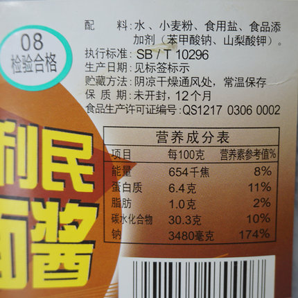 配料表:饮用水、小麦粉、食用盐、食品添加剂(苯甲酸钠、山梨酸钾)