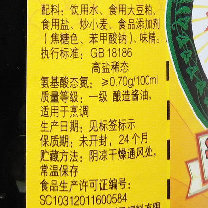 配料表:饮用水、食用大豆粕、食用盐、炒小麦、食品添加剂(焦糖色、苯甲酸钠)味精。