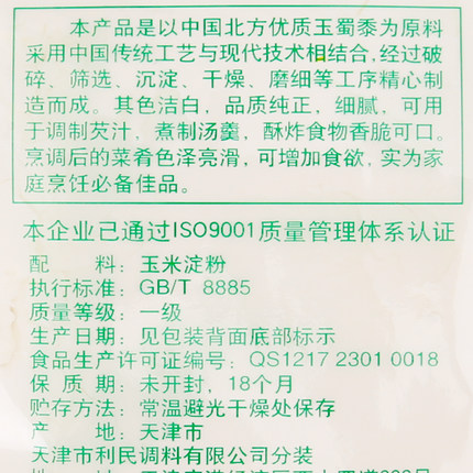 生产许可证编号:SC10312011600584产品标准号:GB/T8885厂名:天津市利民调料有限公司厂址:天津空港经济区西十四道226号配料表:玉米淀粉储藏方法:常温避光干燥处保存保质期:540 天净含量: 160g包装方式: 包装是否为有机食品: 否面粉种类: 淀粉品牌: 利民系列: 利民精制生粉规格: 160g商品条形码: 6901554010634