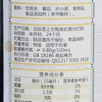配料表:饮用水、黄豆、炒小麦、食用盐、食品添加剂(苯甲酸钠)
