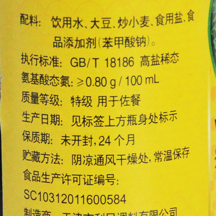配料表:饮用水、大豆、食用盐、炒小麦、食品添加剂(苯甲酸钠)