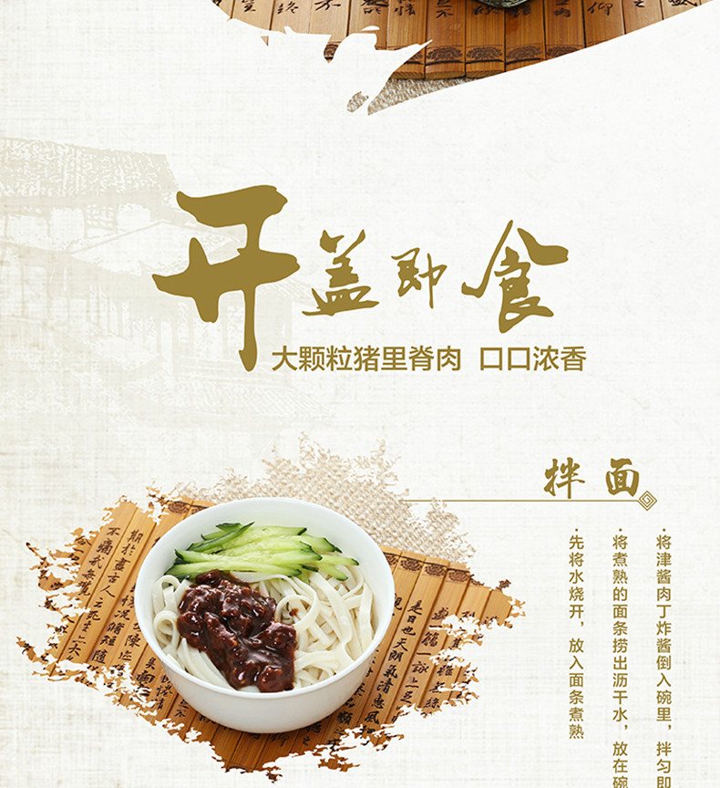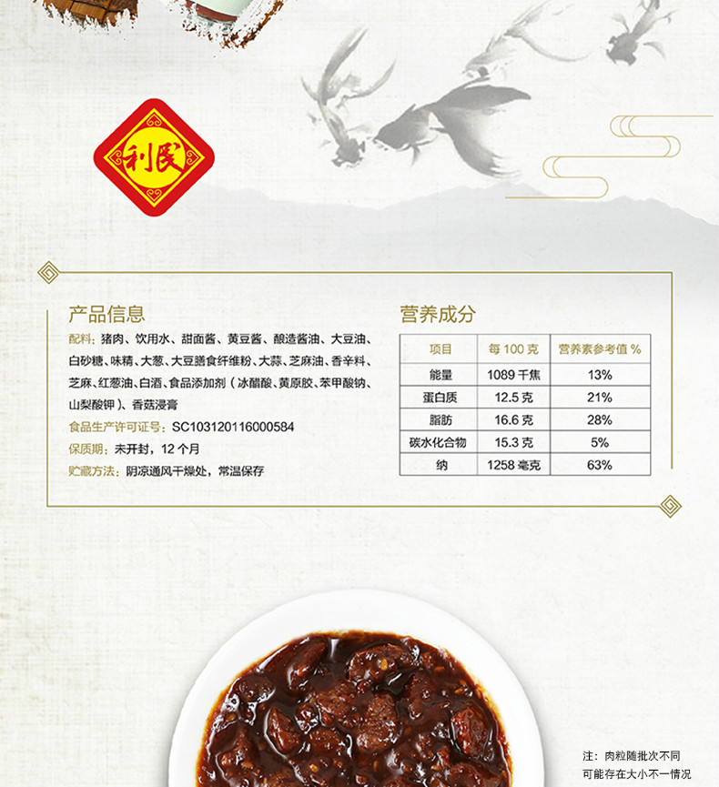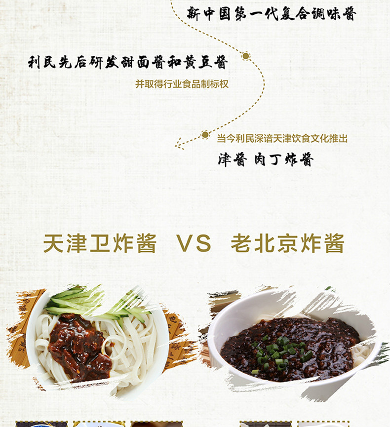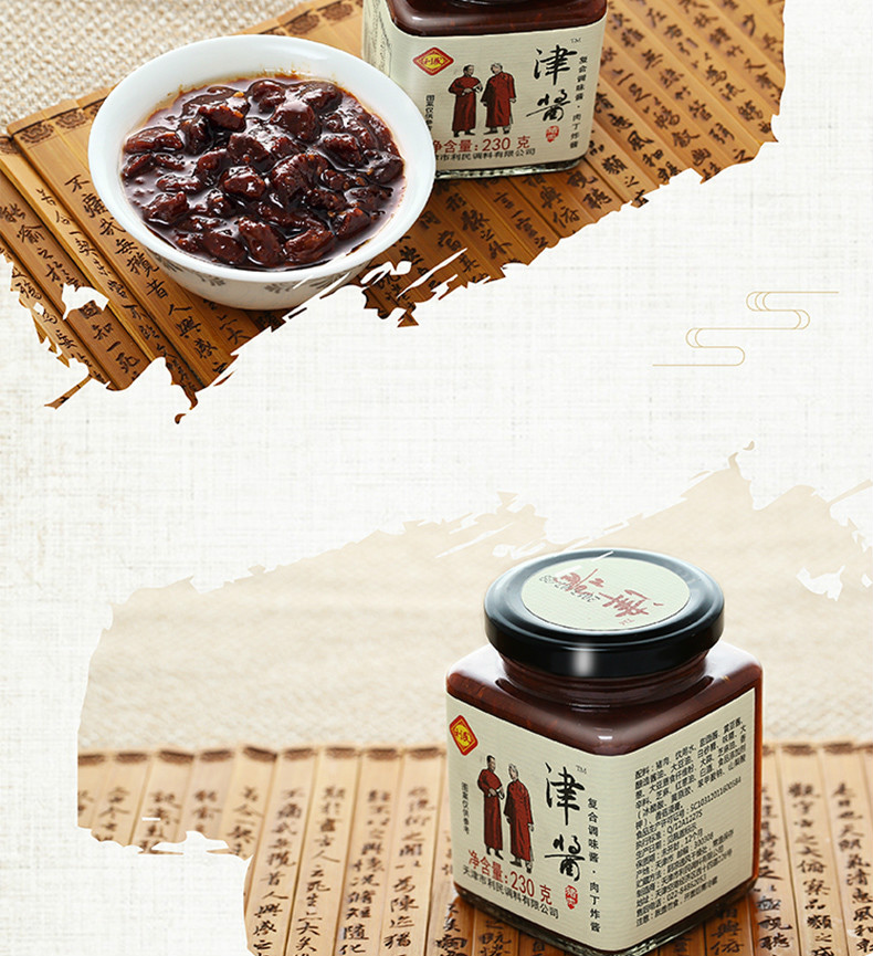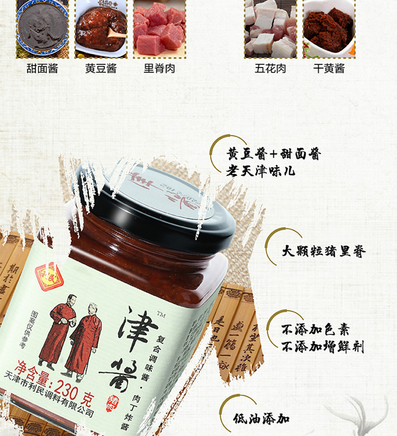 生产许可证编号:SC10312011600584产品标准号:Q/12A1227S厂名:天津市利民调料有限公司厂址:天津空港经济区西十四道226号配料表:饮用水 猪肉 甜面酱 黄豆酱 酿造酱油 大豆油 香辛料 味精 白砂糖 芝麻油 红葱油 白酒 香菇浸膏储藏方法:阴凉通风干燥处 常温保存保质期:360 天食品添加剂:冰醋酸 黄原胶 苯甲酸钠 山梨酸钾净含量: 230g包装方式: 包装是否为有机食品: 否调味料: 炸酱面酱品牌: 利民系列: 津酱-面酱规格: 230g商品条形码: 6901554013154特产品类: 天津酱料