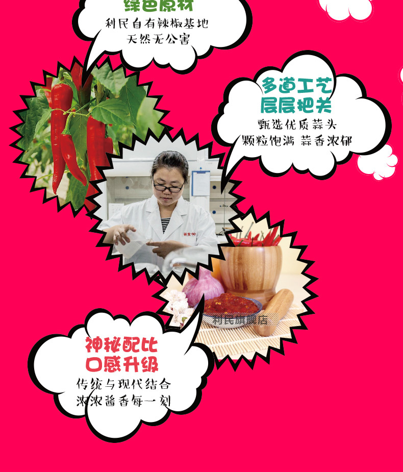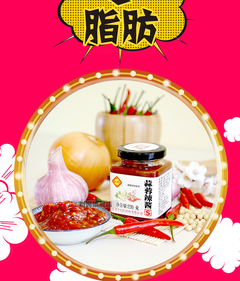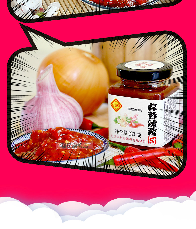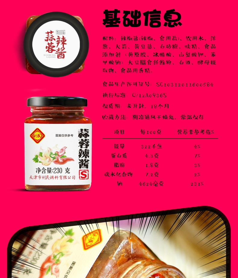 生产许可证编号:SC10312011600584 产品标准号:Q/12A0936S 厂名:天津市利民调料有限公司 厂址:天津空港经济区西十四道226号 配料表:辣椒酱(辣椒 食用盐 柠檬酸 焦亚硫酸钠 氯化钙 山梨酸钾)饮用水 洋葱 大蒜 黄豆酱 白砂糖 味精 食品添加剂(黄原胶 冰醋酸 山梨酸钾 苯甲酸钠)大豆膳食纤维粉 白酒 酵母提取物 食品用香精 储藏方法:阴凉干燥通风处,常温保存 保质期:540 天 食品添加剂:黄原胶 冰醋酸 山梨酸钾 苯甲酸钠 净含量: 460g 包装方式: 散装 品牌: 利民 是否为有机食品: 否 商品条形码: 6901554013147 特产品类: 利民蒜蓉辣酱