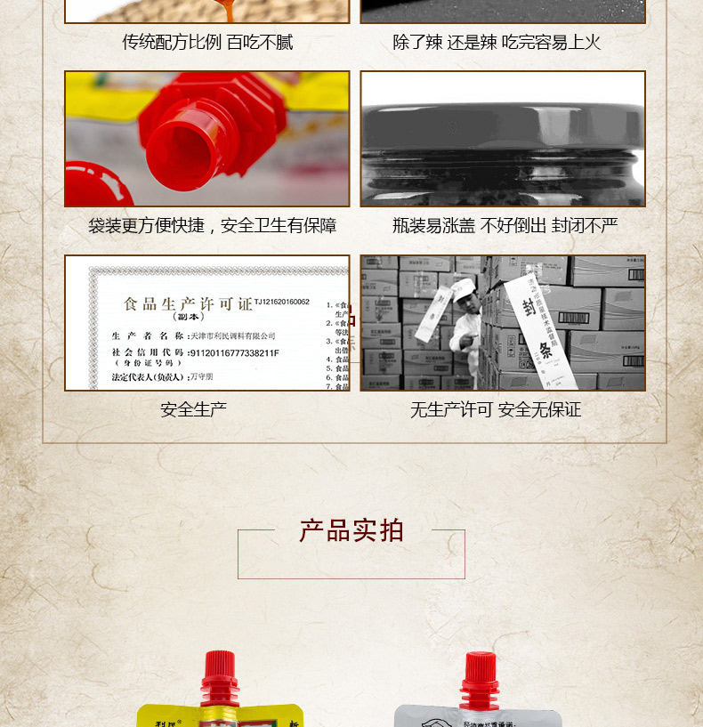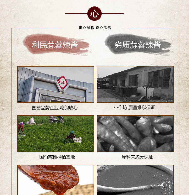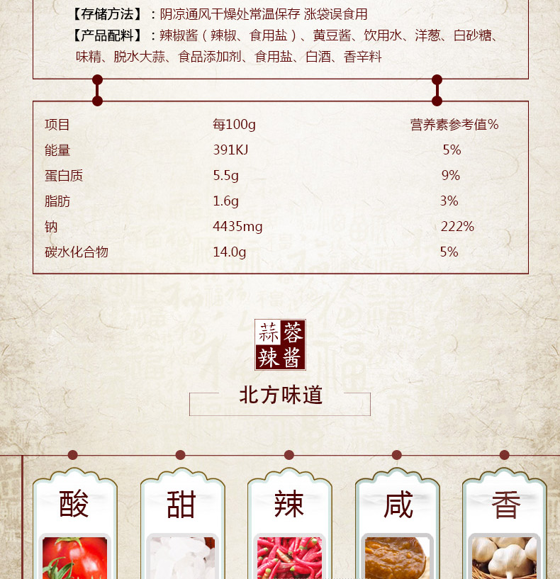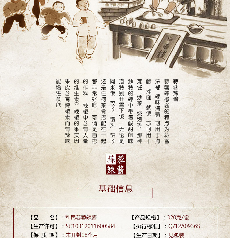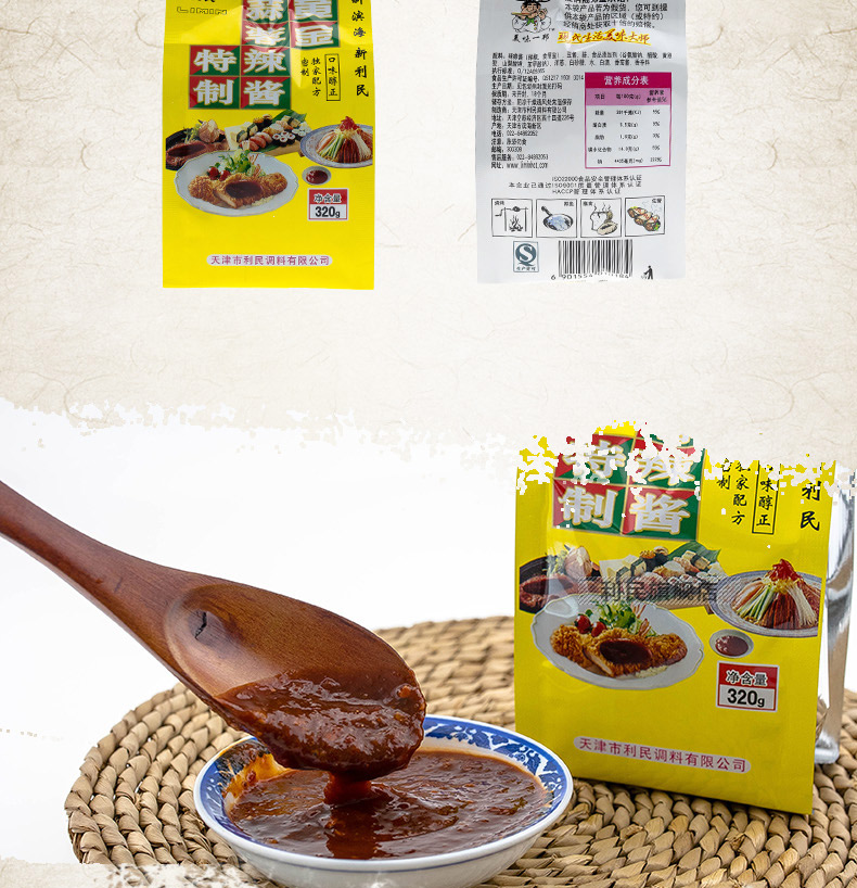 生产许可证编号:SC10312011600584产品标准号:Q/12A0936S厂名:天津市利民调料有限公司厂址:天津空港经济区西十四道226号配料表:辣椒酱(辣椒、食用盐)、黄豆酱、饮用水、洋葱、白砂糖、味精、脱水大蒜、食品添加剂(冰醋酸、黄原胶、苯甲酸钠、山梨酸钾)、食用盐、白酒、香辛料储藏方法:阴凉通风干燥处,常温保存保质期:540 天食品添加剂:冰醋酸、黄原胶、苯甲酸钠、山梨酸钾净含量: 320g包装方式: 包装品牌: 利民是否为有机食品: 否商品条形码: 6901554010184特产品类: 利民蒜蓉辣酱