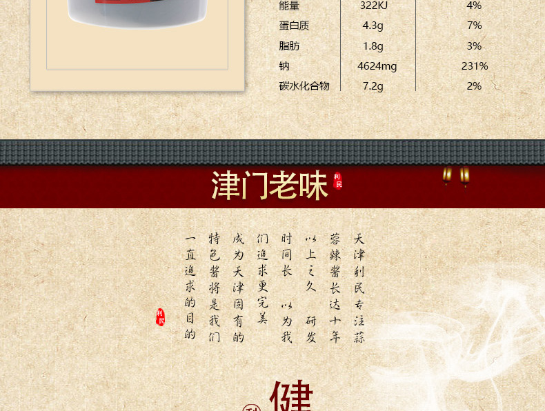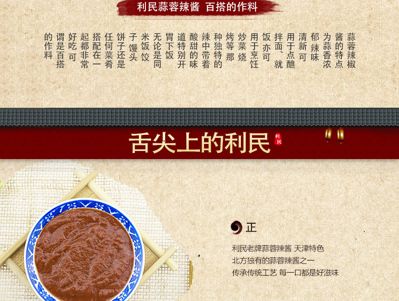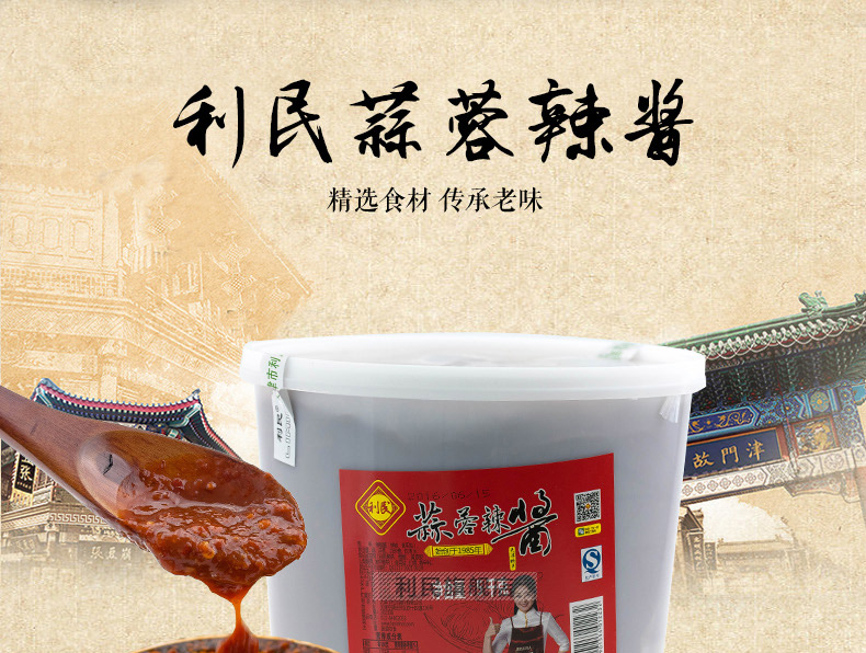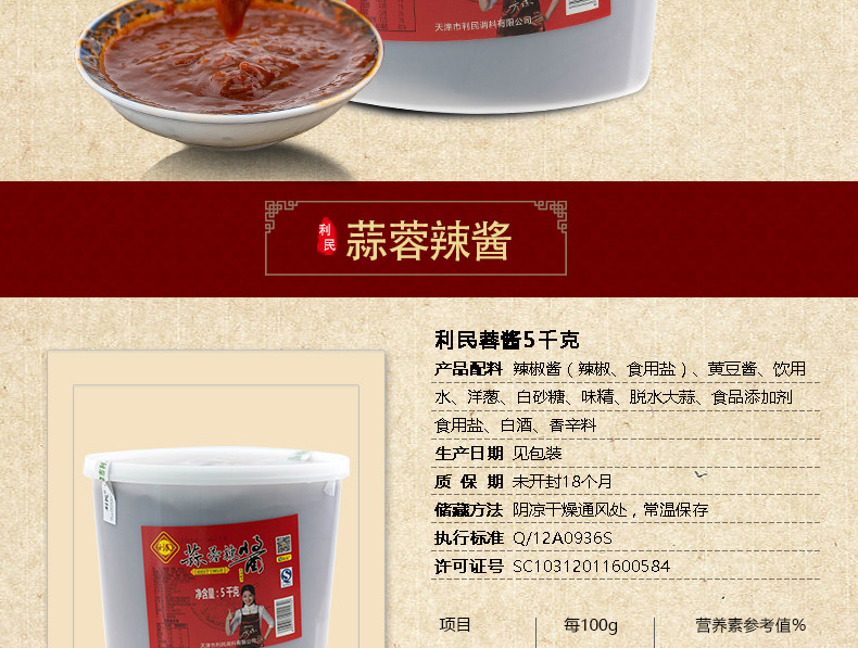 生产许可证编号:SC10312011600584产品标准号:Q/12A0936S厂名:天津市利民调料有限公司厂址:天津空港经济区西十四道226号配料表:辣椒酱(辣椒、食用盐)、黄豆酱、饮用水、洋葱、白砂糖、味精、脱水大蒜、食品添加剂(冰醋酸、黄原胶、苯甲酸钠、山梨酸钾)、食用盐、白酒、香辛料储藏方法:阴凉干燥通风处常温保存保质期:540 天食品添加剂:冰醋酸、黄原胶、苯甲酸钠、山梨酸钾净含量: 5000g包装方式: 包装品牌: 利民是否为有机食品: 否商品条形码: 6901554012232特产品类: 利民蒜蓉辣酱