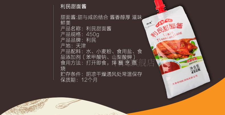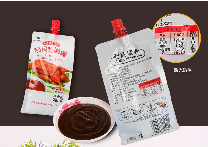 生产许可证编号:SC10312011600584产品标准号:SB/T10296厂名:天津市利民调料有限公司厂址:天津空港经济区西十四道226号配料表:饮用水、小麦粉、食用盐、食品添加剂(苯甲酸钠、山梨酸钾)储藏方法:阴凉通风干燥处常温保存,开封后宜冷藏保质期:365 天食品添加剂:苯甲酸钠,山梨酸钾净含量: 450g包装方式: 包装是否为有机食品: 否调味料: 炸酱面酱品牌: 利民系列: 利民甜面酱规格: 450g商品条形码: 6901554010122特产品类: 利民甜面酱