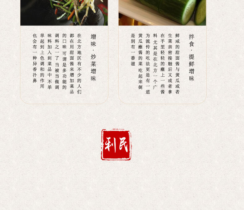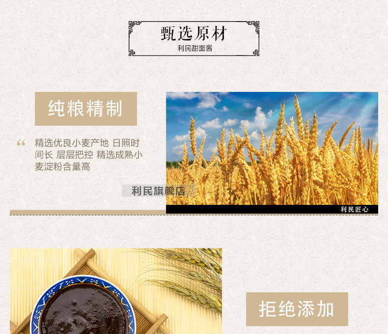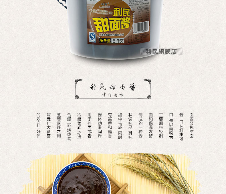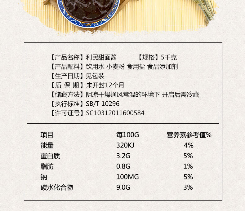 生产许可证编号:QS1217 0306 0002产品标准号:SB/T10296厂名:天津市利民调料有限公司厂址:天津空港经济区西十四道226号配料表:饮用水、小麦粉、食用盐、食品添加剂(苯甲酸钠、山梨酸钾)储藏方法:阴凉干燥通风处常温保存,开封后宜冷藏保质期:365 天食品添加剂:苯甲酸钠、山梨酸钾净含量: 5000g包装方式: 包装是否为有机食品: 否调味料: 其他/other品牌: 利民系列: 甜面酱规格: 5kg商品条形码: 6901554270007特产品类: 利民甜面酱