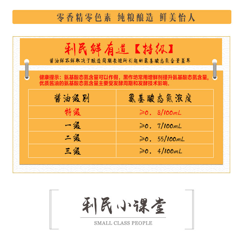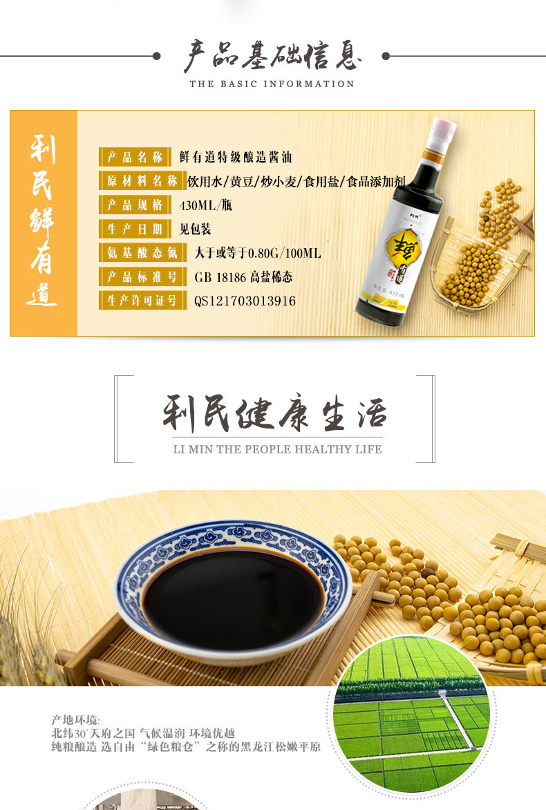 生产许可证编号:SC10312011600584产品标准号:GB 18186厂名:天津市利民调料有限公司厂址:天津空港经济区西十四道226号配料表:饮用水、黄豆、炒小麦、食用盐、食品添加剂(苯甲酸钠)储藏方法:阴凉通风干燥处,常温保存保质期:720 天食品添加剂:苯甲酸钠净含量: 860ml包装方式: 包装是否为有机食品: 否食品工艺: 酿造酱油品牌: 利民系列: 鲜有道酱油规格: 430ml*2商品条形码: 6901554012300产地: 中国大陆省份: 天津酱油类型: 生抽