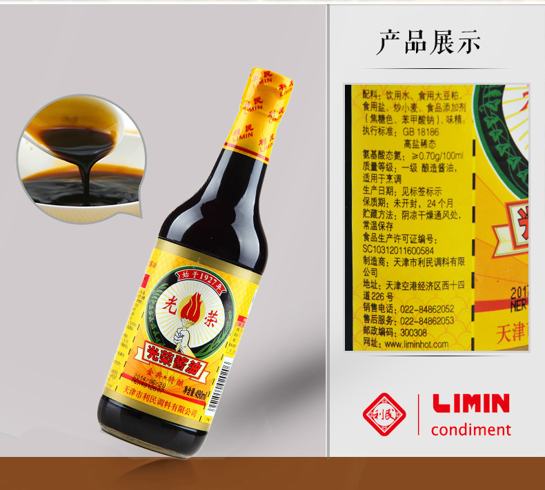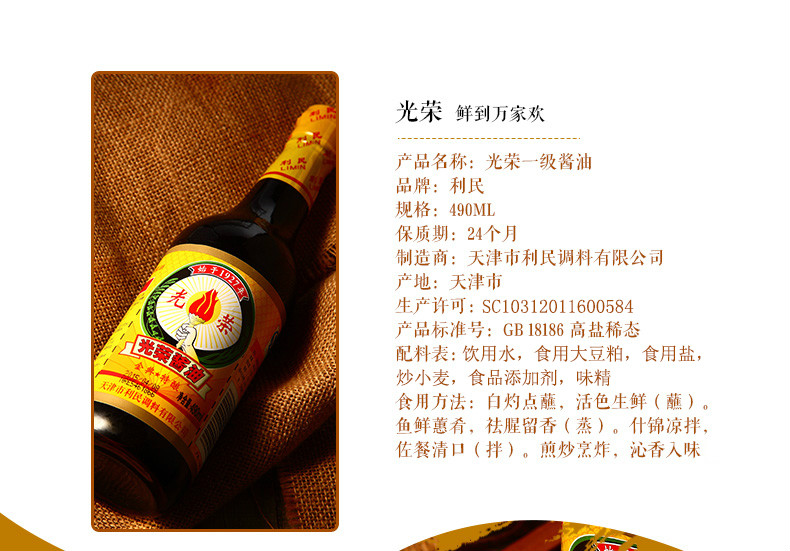 生产许可证编号:SC10312011600584产品标准号:GB18186厂名:天津市利民调料有限公司厂址:天津空港经济区西十四道226号配料表:饮用水、食用大豆粕、食用盐、炒小麦、食品添加剂(焦糖色、苯甲酸钠)味精。储藏方法:阴凉干燥通风处,常温保存保质期:720 天食品添加剂:焦糖色、苯甲酸钠净含量: 490ml包装方式: 包装是否为有机食品: 否食品工艺: 酿造酱油品牌: 光荣系列: 一级酱油规格: 490mL商品条形码: 6901554020206产地: 中国大陆省份: 天津酱油类型: 老抽