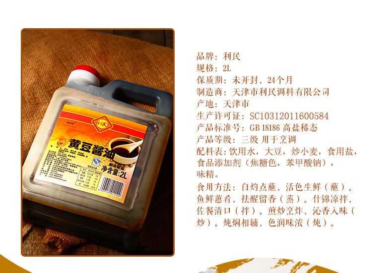 生产许可证编号:SC10312011600584产品标准号:GB18186厂名:天津市利民调料有限公司厂址:天津空港经济区西十四道226号配料表:饮用水、大豆、食用盐、炒小麦、食品添加剂(焦糖色、苯甲酸钠)味精。储藏方法:阴凉通风干燥处,常温保存保质期:720 天食品添加剂:焦糖色、苯甲酸钠)味精。净含量: 2000ml包装方式: 包装是否为有机食品: 否食品工艺: 酿造酱油品牌: 利民系列: 利民光荣酱油规格: 2L商品条形码: 6901554011129产地: 中国大陆省份: 天津酱油类型: 老抽
