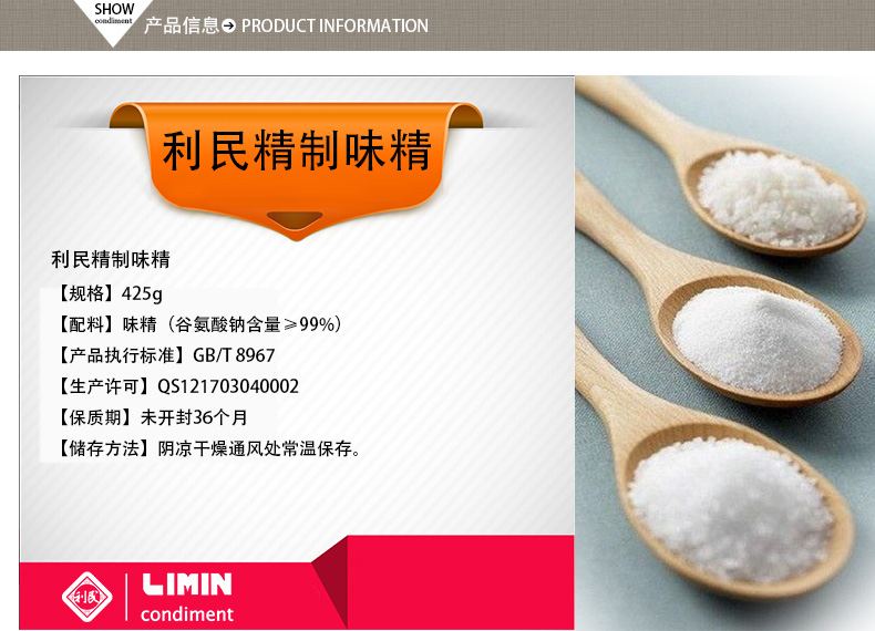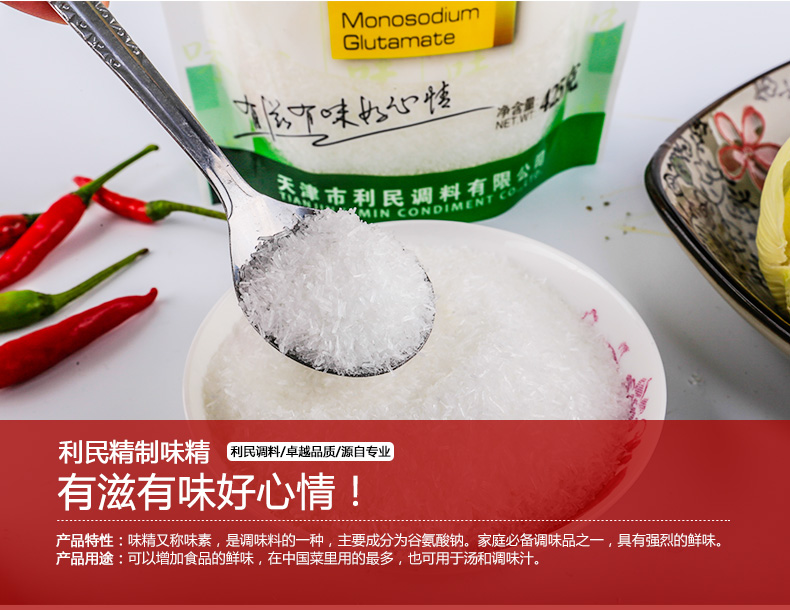 生产许可证编号:QS1217 0304 0002产品标准号:GB/T 8967厂名:天津市利民调料有限公司厂址:天津空港经济区西十四道226号配料表:味精(谷氨酸钠含量≥99%)储藏方法:阴凉通风干燥处,常温保存保质期:1080 天食品添加剂:谷氨酸钠净含量: 425g包装方式: 包装品牌: 利民系列: 利民味精规格: 425g商品条形码: 6901554011167是否为有机食品: 否