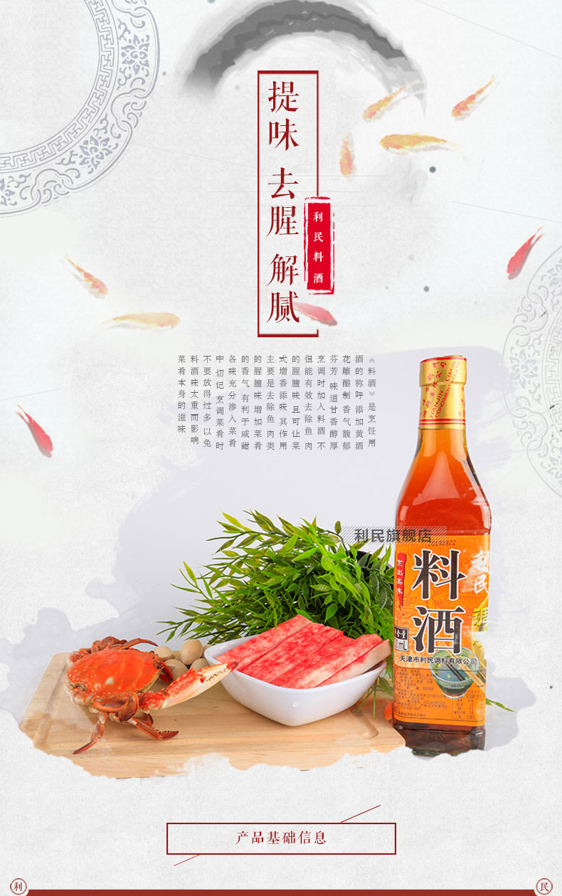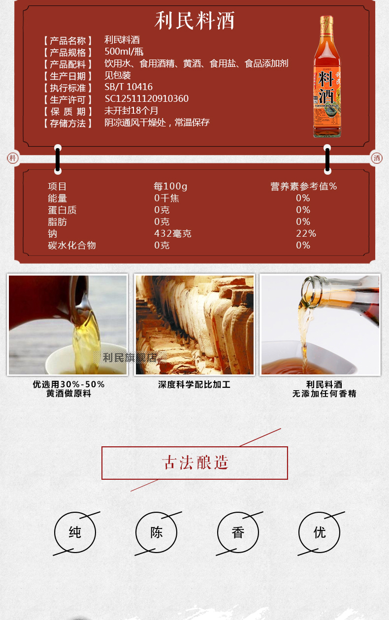 生产许产品标准号:SB/T10416厂名:北京仙源食品酿造有限公司厂址:北京市通州区漷县经济技术开发区配料表:饮用水、食用酒精、黄酒、食用盐、食品添加剂(谷氨酸钠、焦糖色)香辛料。储藏方法:通风避光干燥处,常温保存保质期:540 天食品添加剂:谷氨酸钠、焦糖色、香辛料净含量: 500ml包装方式: 包装品牌: 利民系列: 利民料酒规格: 500ml商品条形码: 6901554660006是否为有机食品: 否