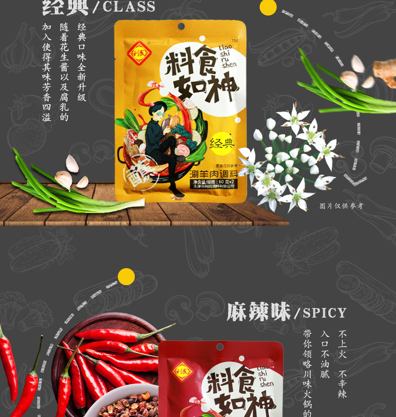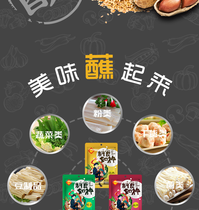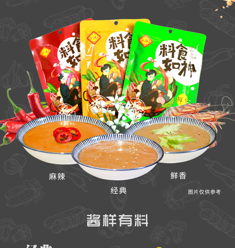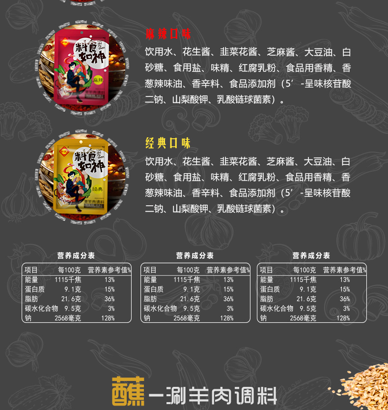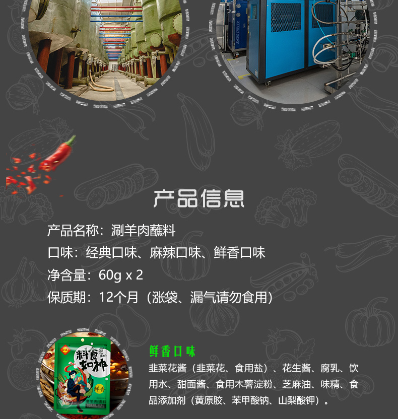 生产许可证编号:SC10312011600584产品标准号:Q/12A1406S厂名:天津市利民调料有限公司厂址:天津空港经济区西十四道226号储藏方法:阴凉干燥通风处,常温保存,冷餐尤佳。保质期:360 天净含量: 360g包装方式: 包装售卖方式: 组合调味料: 火锅蘸料品牌: 利民系列: 蘸料组合规格: 360g产地: 中国大陆省份: 天津